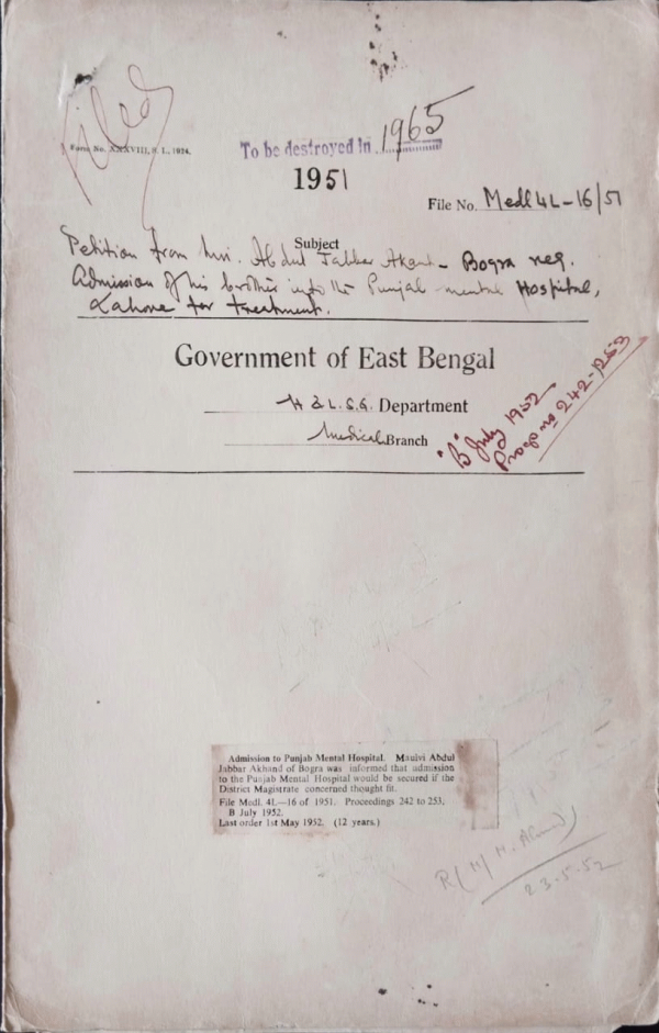 | Rack No. 10, Bundle No. 113, Sl No. 9320 Special pay of the Medical Officers of the Rural Dispensaries of Sylhet District | Rack No. 10, Bundle No. 113, Sl No. 9321 Appointment of Md. Wajed Ali as Officer-in-charge of District Reserve Store, Mymensingh | Rack No. 10, Bundle No. 113, Sl No. 9322 Purchase of Publication of the Six Year Development Programme of Pakistan | Rack No. 10, Bundle No. 113, Sl No. 9323 Mental patients Exchange between Pakistan and India | Rack No. 10, Bundle No. 113, Sl No. 9324 Maintenance charge of the mental patient Birendra Kumar Dhar belonging to Pakistan Dominion | Rack No. 10, Bundle No. 113, Sl No. 9325 Entertainment of a Head Clerk for the Office of the Superintendent Civil Hospital, Sylhet Sanction | Rack No. 10, Bundle No. 113, Sl No. 9326 Transfer of the records criminal Lunatic Nayeb Ali from Dum Dum Central Jail to East Bengal |