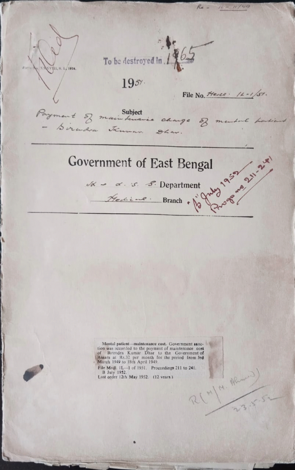 Maintenance charge of the mental patient Birendra Kumar Dhar belonging to Pakistan Dominion