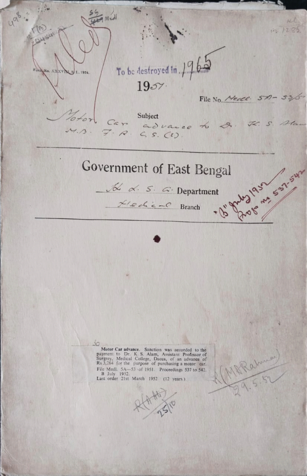 | Rack No. 10, Bundle No. 113, Sl No. 9326 Transfer of the records criminal Lunatic Nayeb Ali from Dum Dum Central Jail to East Bengal | Rack No. 10, Bundle No. 113, Sl No. 9327 Creation of scholarship for the students of the Tibbia College, Sylhet | Rack No. 10, Bundle No. 113, Sl No. 9328 Question of continence of Dr. S.K. Nizamul Islam, Medical Officer of the Barisal Thana Dispensary as District Board, Mymensingh | Rack No. 10, Bundle No. 113, Sl No. 9329 Motor car advance to Dr. K.S. Alam, M.B. F.R.C.S (E) Assistant Professor of surgery Medical College, Dacca | Rack No. 10, Bundle No. 113, Sl No. 9330 Payment of Union bases in respect of Thana Hospital-cum-Dispensary in the District of Bakerganj | Rack No. 10, Bundle No. 113, Sl No. 9331 Payment of freight charges on personal effect Rs. 212/2/2 to Dr. M.A. Rahman | Rack No. 10, Bundle No. 113, Sl No. 9332 Sanction for appointment of a gas maker for the Sylhet Medical School |