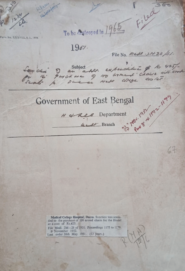 | Rack No. 10, Bundle No. 117 Sl No. 9664 Fitness of Dr. N. T. Barnett. M.B. for a post in the Eastern Pakistan Medical Service (Upper). | Rack No. 10, Bundle No. 117 Sl No. 9665 Security money. | Rack No. 10, Bundle No. 117 Sl No. 9666 Installation of Electric light and fans in the new extension of outpatient department building to be used as emergency and T.B. ward and C. in the General Hospital, Chittagong. | Rack No. 10, Bundle No. 117 Sl No. 9667 Sanction for making furniture in the newly constructed barracks of Dacca Medical College Hostel. | Rack No. 10, Bundle No. 117 Sl No. 9668 Acceptance of Debit vouchers on Purchase from Daller areas. | Rack No. 10, Bundle No. 117 Sl No. 9669 Coding Dr. Miss H. Sayeed as east Pakistan Medical delegate to attend the conference of world Singapure. | Rack No. 10, Bundle No. 117 Sl No. 9670 Appointment of Dr. Mis. Mansur Ally as Assistant Prof. of Pharmacology, Medical College Dacca. |