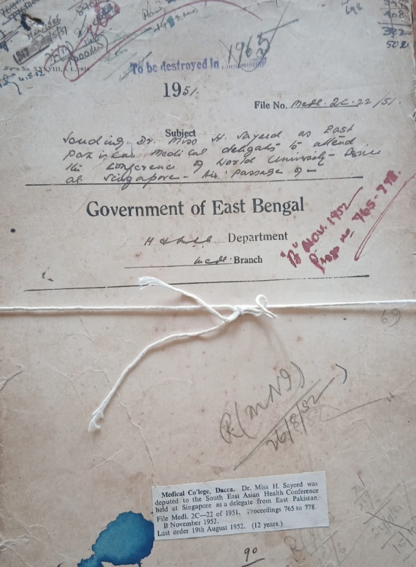 Coding Dr. Miss H. Sayeed as east Pakistan Medical delegate to attend the conference of world Singapure.