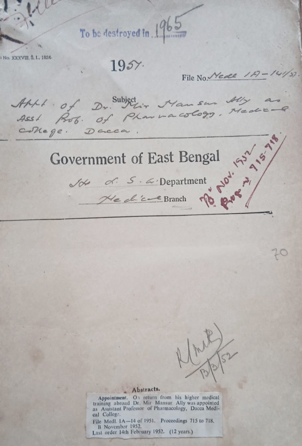 Appointment of Dr. Mis. Mansur Ally as Assistant Prof. of Pharmacology, Medical College Dacca.