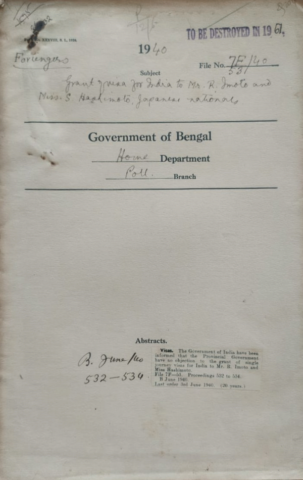 | Rack No. 42, Bundle No. 07, Sl No. 411 Arrival at Calcutta of Mr. E.K. Hockstra, a Dutch National with an expired visa for India. | Rack No. 42, Bundle No. 07, Sl No. 412 Refusal of Passport facilities to Some Persons by the Resident for Rajputana. | Rack No. 42, Bundle No. 07, Sl No. 413 Proposed repatriation for England to India of Miss. P.N. Foster. | Rack No. 42, Bundle No. 07, Sl No. 414 Grant of Visa for India to Mvi. R. Imoto and Miss. S. Hashimoto Japanese Nationals. | Rack No. 42, Bundle No. 07, Sl No. 415 Proposed grant of a visa for India to K. Asaoka, Japanese National. | Rack No. 42, Bundle No. 07, Sl No. 416 Proposed grant of a visa for India to Professor Alexander Kalituisky an Ex-Russian now residing in France. | Rack No. 42, Bundle No. 07, Sl No. 417 Proposed grant of Passport facilities to Mr. Ezra Shalome Daniel Ezckiel. |