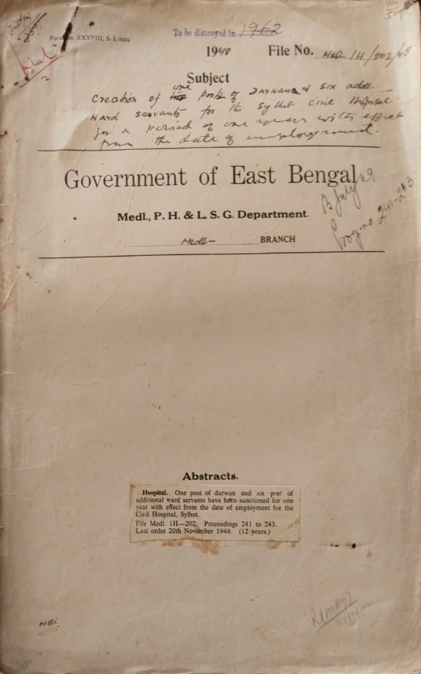 Creation of one post of Darwan & six additional ward servants for the Sylhet Civil Hospital.