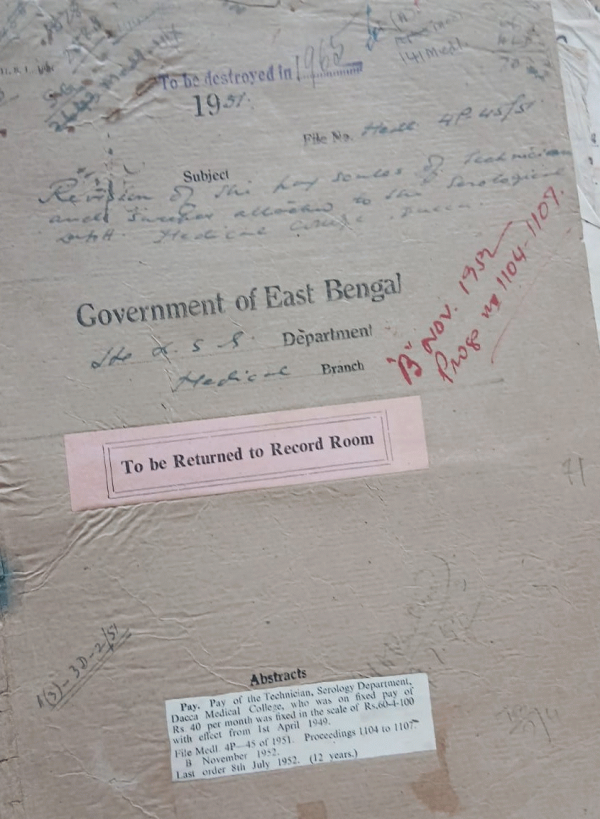 | Rack No. 10, Bundle No. 117 Sl No. 9668 Acceptance of Debit vouchers on Purchase from Daller areas. | Rack No. 10, Bundle No. 117 Sl No. 9669 Coding Dr. Miss H. Sayeed as east Pakistan Medical delegate to attend the conference of world Singapure. | Rack No. 10, Bundle No. 117 Sl No. 9670 Appointment of Dr. Mis. Mansur Ally as Assistant Prof. of Pharmacology, Medical College Dacca. | Rack No. 10, Bundle No. 117 Sl No. 9671 Status of the Laboratory Assistant and the Technicians. | Rack No. 10, Bundle No. 117 Sl No. 9672 Construction of qus. for 10 Nursing sisters and 30 extra probationer Nurse in the compound of the Medical College Hospital Dacca. | Rack No. 10, Bundle No. 117 Sl No. 9673 Report on Nursing Aspects of Pakistan by Miss. E. Magnussen. | Rack No. 10, Bundle No. 117 Sl No. 9674 Central Nursing Council of Pakistan Regulation. |