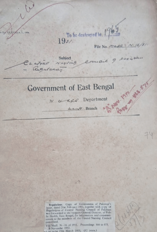 | Rack No. 10, Bundle No. 117 Sl No. 9671 Status of the Laboratory Assistant and the Technicians. | Rack No. 10, Bundle No. 117 Sl No. 9672 Construction of qus. for 10 Nursing sisters and 30 extra probationer Nurse in the compound of the Medical College Hospital Dacca. | Rack No. 10, Bundle No. 117 Sl No. 9673 Report on Nursing Aspects of Pakistan by Miss. E. Magnussen. | Rack No. 10, Bundle No. 117 Sl No. 9674 Central Nursing Council of Pakistan Regulation. | Rack No. 10, Bundle No. 117 Sl No. 9675 Payment of the arrear change of the Meherpur Prov. Hospital Kusthia. | Rack No. 10, Bundle No. 117 Sl No. 9676 Prayer of Mvi. Kazi Shamsuddin Ahmed U.D. Assistant of the Central Medical Stores for free gift of 3 vials of Aureomycin. | Rack No. 10, Bundle No. 117 Sl No. 9677 Repatriation of mental patient Miss. Malati Datta. |