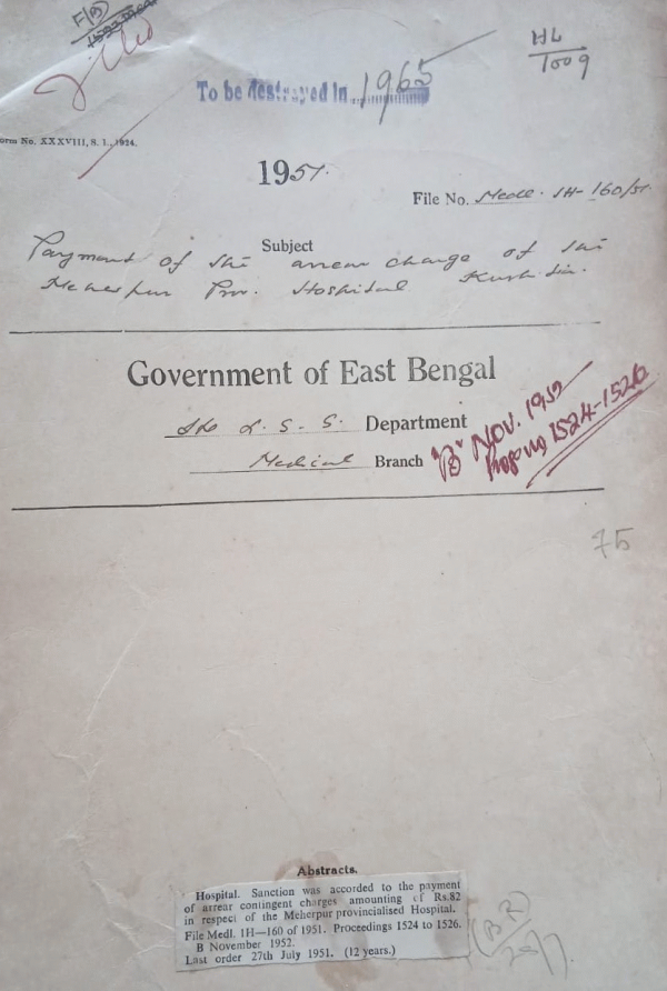 | Rack No. 10, Bundle No. 117 Sl No. 9672 Construction of qus. for 10 Nursing sisters and 30 extra probationer Nurse in the compound of the Medical College Hospital Dacca. | Rack No. 10, Bundle No. 117 Sl No. 9673 Report on Nursing Aspects of Pakistan by Miss. E. Magnussen. | Rack No. 10, Bundle No. 117 Sl No. 9674 Central Nursing Council of Pakistan Regulation. | Rack No. 10, Bundle No. 117 Sl No. 9675 Payment of the arrear change of the Meherpur Prov. Hospital Kusthia. | Rack No. 10, Bundle No. 117 Sl No. 9676 Prayer of Mvi. Kazi Shamsuddin Ahmed U.D. Assistant of the Central Medical Stores for free gift of 3 vials of Aureomycin. | Rack No. 10, Bundle No. 117 Sl No. 9677 Repatriation of mental patient Miss. Malati Datta. | Rack No. 10, Bundle No. 117 Sl No. 9678 Improvement to the Sadar Hospital at Comilla and Sub-Divisional Hospital at Brahmanbaria. |