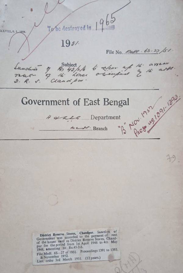 | Rack No. 10, Bundle No. 117 Sl No. 9676 Prayer of Mvi. Kazi Shamsuddin Ahmed U.D. Assistant of the Central Medical Stores for free gift of 3 vials of Aureomycin. | Rack No. 10, Bundle No. 117 Sl No. 9677 Repatriation of mental patient Miss. Malati Datta. | Rack No. 10, Bundle No. 117 Sl No. 9678 Improvement to the Sadar Hospital at Comilla and Sub-Divisional Hospital at Brahmanbaria. | Rack No. 10, Bundle No. 117 Sl No. 9679 Arrear house rent of the Chandpur Additional D.R.S. | Rack No. 10, Bundle No. 117 Sl No. 9680 Grant of an advance Rs. from the Col. found to Mr. K.F. Rahman P.A. | Rack No. 10, Bundle No. 117 Sl No. 9681 Appointment of contractors for supply of articles of different groups to the Mitford Hospital, Dacca. | Rack No. 10, Bundle No. 117 Sl No. 9682 Sanction to the expenditure for making liveries. |