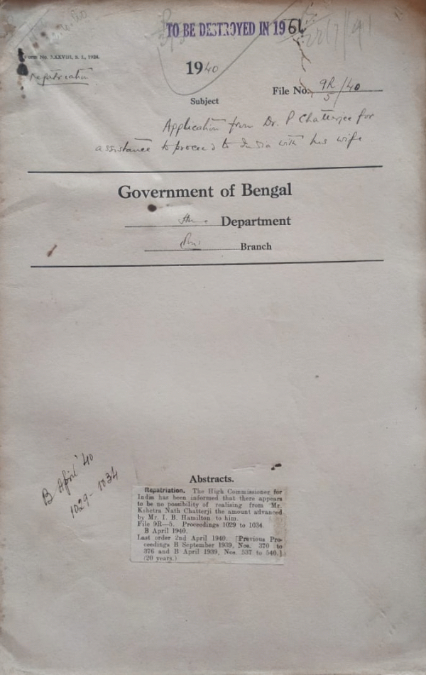 Application from Dr. P Chatterjee for assistance to proceed to India with his wife.