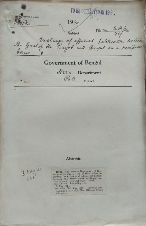 Exchange of official Publications between the govt. of the Punjab and Bengal on a reciprocal basis.