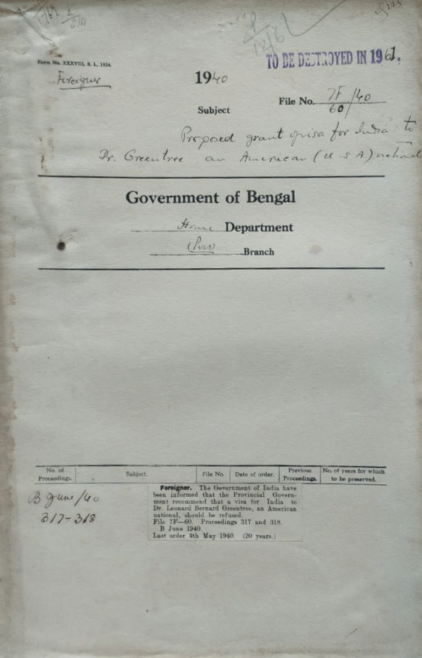 Proposed grant of visa for India to Dr. Greentree an American National.