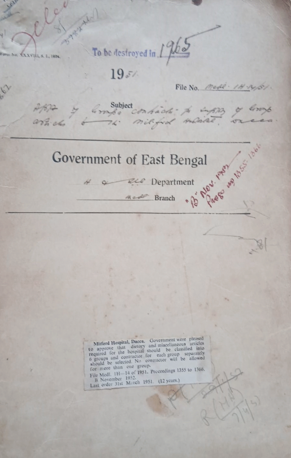 | Rack No. 10, Bundle No. 117 Sl No. 9678 Improvement to the Sadar Hospital at Comilla and Sub-Divisional Hospital at Brahmanbaria. | Rack No. 10, Bundle No. 117 Sl No. 9679 Arrear house rent of the Chandpur Additional D.R.S. | Rack No. 10, Bundle No. 117 Sl No. 9680 Grant of an advance Rs. from the Col. found to Mr. K.F. Rahman P.A. | Rack No. 10, Bundle No. 117 Sl No. 9681 Appointment of contractors for supply of articles of different groups to the Mitford Hospital, Dacca. | Rack No. 10, Bundle No. 117 Sl No. 9682 Sanction to the expenditure for making liveries. | Rack No. 10, Bundle No. 117 Sl No. 9683 T.A. Bill of Mr. Muzammal Hossain M.L.A. from Kulna to Dacca. | Rack No. 10, Bundle No. 117 Sl No. 9684 Government sanction for repair of the Jeep attached to this Directorate. |