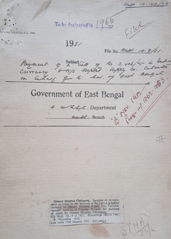 | Rack No. 10, Bundle No. 117 Sl No. 9684 Government sanction for repair of the Jeep attached to this Directorate. | Rack No. 10, Bundle No. 117 Sl No. 9685 Accommodation of cats in the Chemical Examiners laboratory at Dacca Medical College. | Rack No. 10, Bundle No. 117 Sl No. 9686 Rent of extra Godawn at Netaiganj Narayanganj. | Rack No. 10, Bundle No. 117 Sl No. 9687 Purchase of equipment. | Rack No. 10, Bundle No. 117 Sl No. 9688 Write off (Sadislieylate). | Rack No. 10, Bundle No. 117 Sl No. 9689 Refugee of the amount overdrawn by Babu Asuini K. Roy of the Chemical examiners Department Dacca. | Rack No. 10, Bundle No. 117 Sl No. 9690 T.A. and D.A. of the menials attending Drugs Technical advisory Board Karachi. |