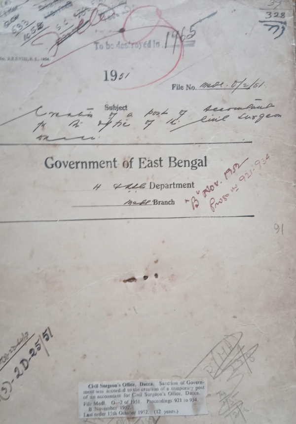 | Rack No. 10, Bundle No. 117 Sl No. 9688 Write off (Sadislieylate). | Rack No. 10, Bundle No. 117 Sl No. 9689 Refugee of the amount overdrawn by Babu Asuini K. Roy of the Chemical examiners Department Dacca. | Rack No. 10, Bundle No. 117 Sl No. 9690 T.A. and D.A. of the menials attending Drugs Technical advisory Board Karachi. | Rack No. 10, Bundle No. 117 Sl No. 9691 Creation of a Post of Account an + for the office of the civil Surgeon, Dacca. | Rack No. 10, Bundle No. 117 Sl No. 9692 Acquisition of land for extension of Dispy. Compound in front of the Hatibandha Dispy. as well as for the construction of office and quarter of the Circle Sanitary Inspector. | Rack No. 10, Bundle No. 117 Sl No. 9694 Reimbursement of the cost of Medical treatment of Mr. A.M. Salimullah, Register Co-operative Societies East Bengal. | Rack No. 10, Bundle No. 117 Sl No. 9694 Instructions for the Sub-mission receipt and transmission of certain classes of petitions to the government general. |