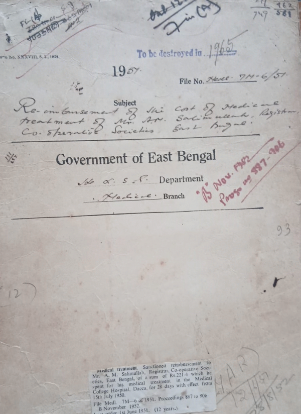 | Rack No. 10, Bundle No. 117 Sl No. 9690 T.A. and D.A. of the menials attending Drugs Technical advisory Board Karachi. | Rack No. 10, Bundle No. 117 Sl No. 9691 Creation of a Post of Account an + for the office of the civil Surgeon, Dacca. | Rack No. 10, Bundle No. 117 Sl No. 9692 Acquisition of land for extension of Dispy. Compound in front of the Hatibandha Dispy. as well as for the construction of office and quarter of the Circle Sanitary Inspector. | Rack No. 10, Bundle No. 117 Sl No. 9694 Reimbursement of the cost of Medical treatment of Mr. A.M. Salimullah, Register Co-operative Societies East Bengal. | Rack No. 10, Bundle No. 117 Sl No. 9694 Instructions for the Sub-mission receipt and transmission of certain classes of petitions to the government general. | Rack No. 10, Bundle No. 117 Sl No. 9695 Constitution of a selection committee for admission T.B. Patients in the S.K. Hospital Mymensingh. | Rack No. 10, Bundle No. 117 Sl No. 9696 Fixation of pay of Dr. Abdus Samad Chowdhury. |