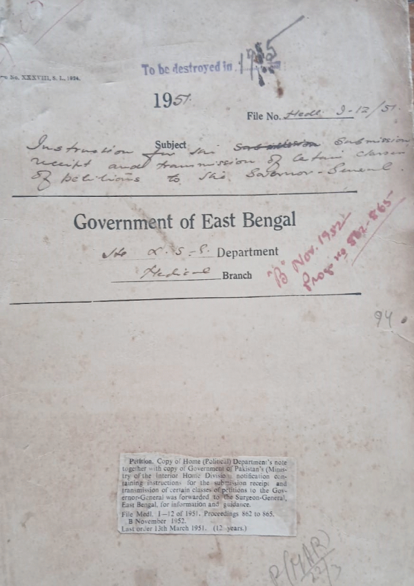 | Rack No. 10, Bundle No. 117 Sl No. 9691 Creation of a Post of Account an + for the office of the civil Surgeon, Dacca. | Rack No. 10, Bundle No. 117 Sl No. 9692 Acquisition of land for extension of Dispy. Compound in front of the Hatibandha Dispy. as well as for the construction of office and quarter of the Circle Sanitary Inspector. | Rack No. 10, Bundle No. 117 Sl No. 9694 Reimbursement of the cost of Medical treatment of Mr. A.M. Salimullah, Register Co-operative Societies East Bengal. | Rack No. 10, Bundle No. 117 Sl No. 9694 Instructions for the Sub-mission receipt and transmission of certain classes of petitions to the government general. | Rack No. 10, Bundle No. 117 Sl No. 9695 Constitution of a selection committee for admission T.B. Patients in the S.K. Hospital Mymensingh. | Rack No. 10, Bundle No. 117 Sl No. 9696 Fixation of pay of Dr. Abdus Samad Chowdhury. | Rack No. 10, Bundle No. 117 Sl No. 9697 Common wealth programme of Technical Assistance. |