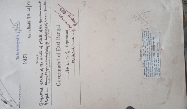 | Rack No. 10, Bundle No. 117 Sl No. 9695 Constitution of a selection committee for admission T.B. Patients in the S.K. Hospital Mymensingh. | Rack No. 10, Bundle No. 117 Sl No. 9696 Fixation of pay of Dr. Abdus Samad Chowdhury. | Rack No. 10, Bundle No. 117 Sl No. 9697 Common wealth programme of Technical Assistance. | Rack No. 10, Bundle No. 117 Sl No. 9698 Gazetted status of the posts of pilots of the government Flight Medical facilities to the Pilots. | Rack No. 10, Bundle No. 117 Sl No. 9699 Scientific and Technical Manpower Committee present and future requirements of scientific and technical manpower. | Rack No. 10, Bundle No. 117 Sl No. 9700 V.R. of Dr. Syed Anwar Ali. | Rack No. 10, Bundle No. 117 Sl No. 9701 Temporary Arrangement inplace of Dr. Akhtaruddin Ahmed S. Sylhet Since Retired. |