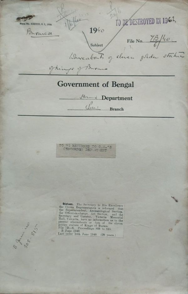 | Rack No. 42, Bundle No. 07, Sl No. 467 Grant of visa for India to MR. Rajab Ali Madalian, Iranian National. | Rack No. 42, Bundle No. 07, Sl No. 468 Deportation of Kharak Bahadur from Bangkok. | Rack No. 42, Bundle No. 07, Sl No. 469 Decision regarding appointment to posts reserved for a certain community when a suitable candidate is not available. | Rack No. 42, Bundle No. 07, Sl No. 470 Whereabouts of eleven golden statues of kings of Burma. | Rack No. 42, Bundle No. 07, Sl No. 471 Naturalization of Mr. C. Beckdal a Danish National under B. N and S.A. Act, 1914. | Rack No. 42, Bundle No. 07, Sl No. 472 Donation made by Mr. Dhirendra Narayan Roy, one of the properties of the Lalgola Raj State, to the Bengal Boy Scout Movement. | Rack No. 42, Bundle No. 07, Sl No. 473 Egyptian Visas has been forwarded to commissioner of police. calcutta and Deputy Inspector-General of police, Intelligence Branch, Criminal Investigation Department Bengal. |