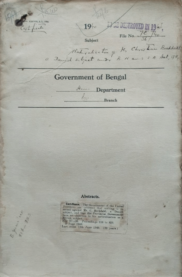 | Rack No. 42, Bundle No. 07, Sl No. 468 Deportation of Kharak Bahadur from Bangkok. | Rack No. 42, Bundle No. 07, Sl No. 469 Decision regarding appointment to posts reserved for a certain community when a suitable candidate is not available. | Rack No. 42, Bundle No. 07, Sl No. 470 Whereabouts of eleven golden statues of kings of Burma. | Rack No. 42, Bundle No. 07, Sl No. 471 Naturalization of Mr. C. Beckdal a Danish National under B. N and S.A. Act, 1914. | Rack No. 42, Bundle No. 07, Sl No. 472 Donation made by Mr. Dhirendra Narayan Roy, one of the properties of the Lalgola Raj State, to the Bengal Boy Scout Movement. | Rack No. 42, Bundle No. 07, Sl No. 473 Egyptian Visas has been forwarded to commissioner of police. calcutta and Deputy Inspector-General of police, Intelligence Branch, Criminal Investigation Department Bengal. | Rack No. 42, Bundle No. 07, Sl No. 474 Refusal of Passport facilities to persons by the govt. of Punjab. |