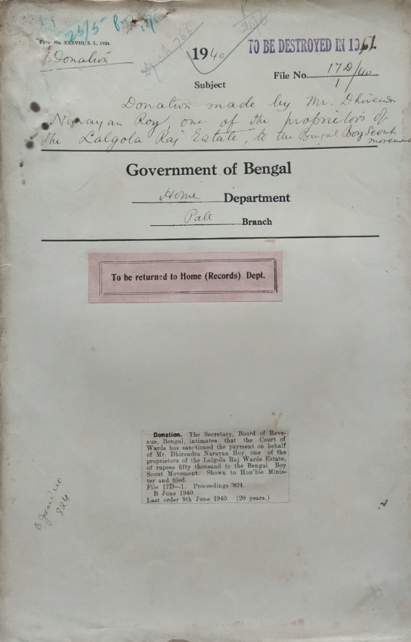 Donation made by Mr. Dhirendra Narayan Roy, one of the properties of the Lalgola Raj State, to the Bengal Boy Scout Movement.