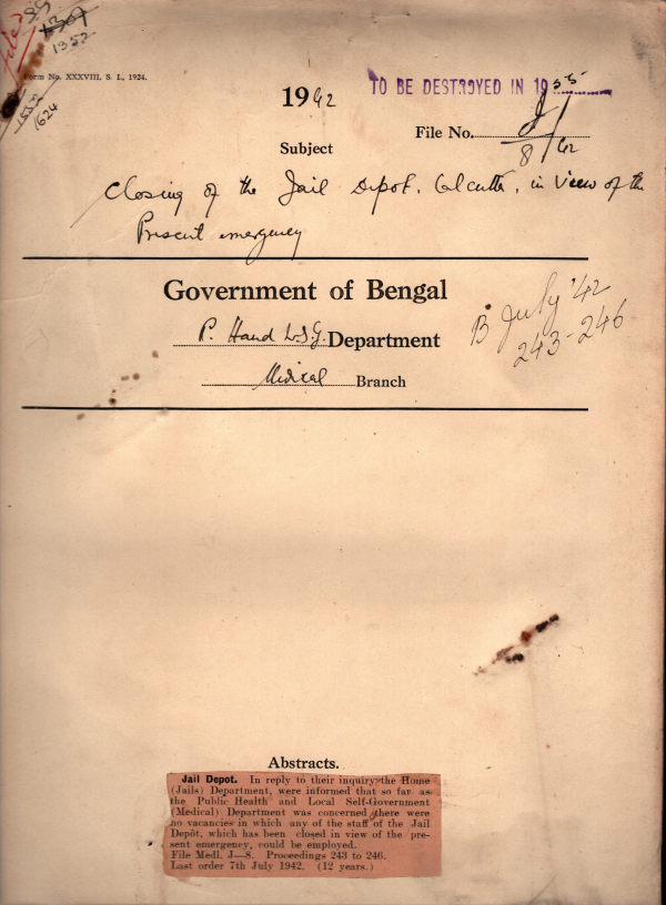 Closing of the Jail Depot, Calcutta, in view of the present emergency.