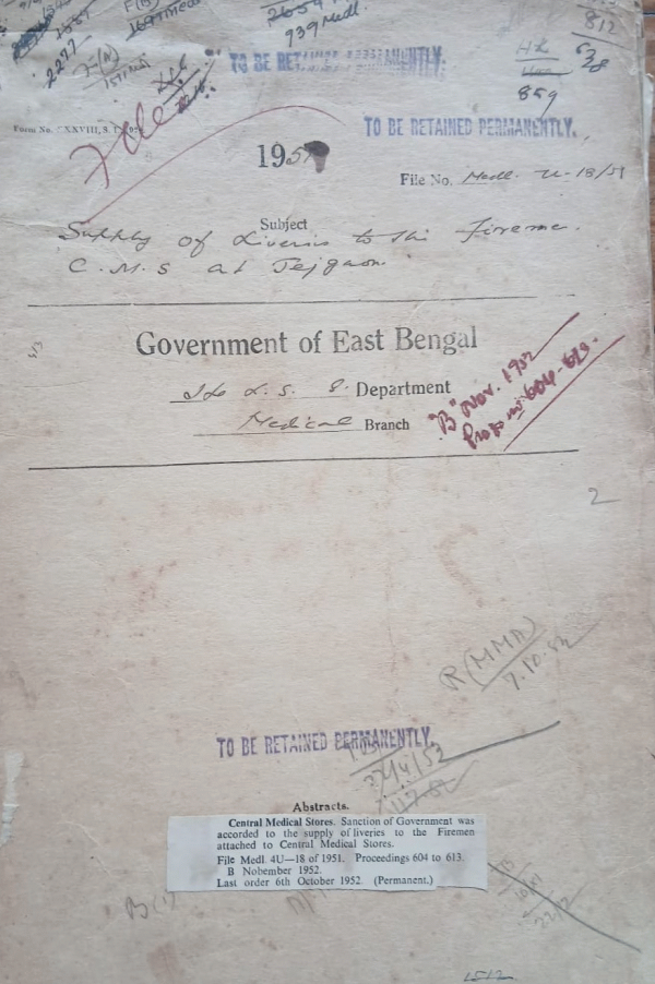 | Rack No. 10, Bundle No. 117 Sl No. 9699 Scientific and Technical Manpower Committee present and future requirements of scientific and technical manpower. | Rack No. 10, Bundle No. 117 Sl No. 9700 V.R. of Dr. Syed Anwar Ali. | Rack No. 10, Bundle No. 117 Sl No. 9701 Temporary Arrangement inplace of Dr. Akhtaruddin Ahmed S. Sylhet Since Retired. | Rack No. 10, Bundle No. 117 Sl No. 9702 Supply of liveries to the Firemen C.M.S. at Tejgaon. | Rack No. 10, Bundle No. 117 Sl No. 9703 Tuition fees of November, 4th year students of the Dacca Medical School. | Rack No. 10, Bundle No. 117 Sl No. 9704 Sanction for the excess contingent expenditure of Baradi Govt. outdoor dispy. for july, 49 Aug. 49 February and March, 50. | Rack No. 10, Bundle No. 117 Sl No. 9705 Payment of the arrear charges of the Mitford Hospital, Dacca. |
