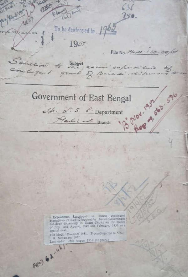 | Rack No. 10, Bundle No. 117 Sl No. 9701 Temporary Arrangement inplace of Dr. Akhtaruddin Ahmed S. Sylhet Since Retired. | Rack No. 10, Bundle No. 117 Sl No. 9702 Supply of liveries to the Firemen C.M.S. at Tejgaon. | Rack No. 10, Bundle No. 117 Sl No. 9703 Tuition fees of November, 4th year students of the Dacca Medical School. | Rack No. 10, Bundle No. 117 Sl No. 9704 Sanction for the excess contingent expenditure of Baradi Govt. outdoor dispy. for july, 49 Aug. 49 February and March, 50. | Rack No. 10, Bundle No. 117 Sl No. 9705 Payment of the arrear charges of the Mitford Hospital, Dacca. | Rack No. 10, Bundle No. 117 Sl No. 9706 Transfer of agency work of the State Bank of Pakistan form the imperial Bank of India to the National Bank of Pakistan. | Rack No. 10, Bundle No. 117 Sl No. 9707 House rent allowance to the Medical officer of the Khulna T.B. & Hospital. |