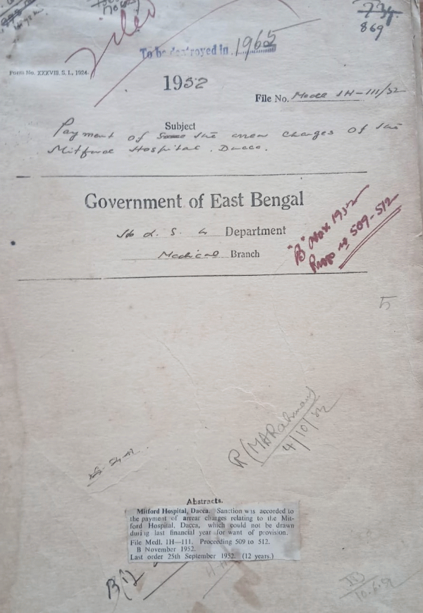 | Rack No. 10, Bundle No. 117 Sl No. 9702 Supply of liveries to the Firemen C.M.S. at Tejgaon. | Rack No. 10, Bundle No. 117 Sl No. 9703 Tuition fees of November, 4th year students of the Dacca Medical School. | Rack No. 10, Bundle No. 117 Sl No. 9704 Sanction for the excess contingent expenditure of Baradi Govt. outdoor dispy. for july, 49 Aug. 49 February and March, 50. | Rack No. 10, Bundle No. 117 Sl No. 9705 Payment of the arrear charges of the Mitford Hospital, Dacca. | Rack No. 10, Bundle No. 117 Sl No. 9706 Transfer of agency work of the State Bank of Pakistan form the imperial Bank of India to the National Bank of Pakistan. | Rack No. 10, Bundle No. 117 Sl No. 9707 House rent allowance to the Medical officer of the Khulna T.B. & Hospital. | Rack No. 10, Bundle No. 117 Sl No. 9708 House rent allowance to Dr. Moniruddin Chowdhury, M.O. Nishividra out-door Dispy. Bogra. |