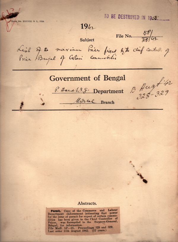 List of the maximum Prices fixed by the chief controller of Price, Bengal of Certain Commodities.
