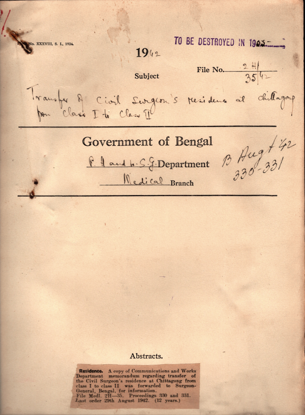 Transfer of Civil Surgeons residence at Chittagong from Class I to Class II.