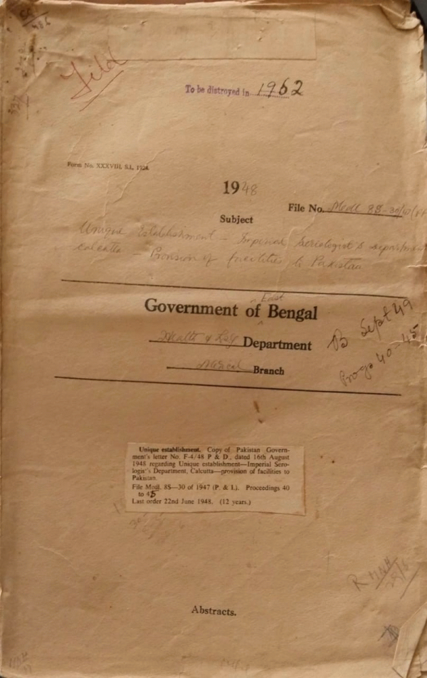 Unique Establishment imperial serologist's Department Calcutta Provision of facilities to Pakistan.