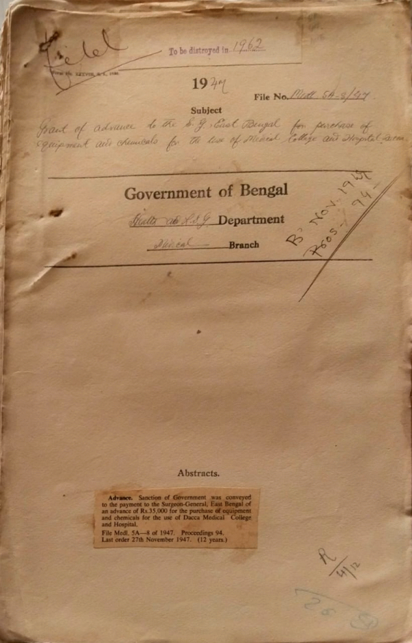 Grant of advance to the S.G. East Bengal for purchase of equipment and Chemicals for the use of medical college and Hospital Dacca.