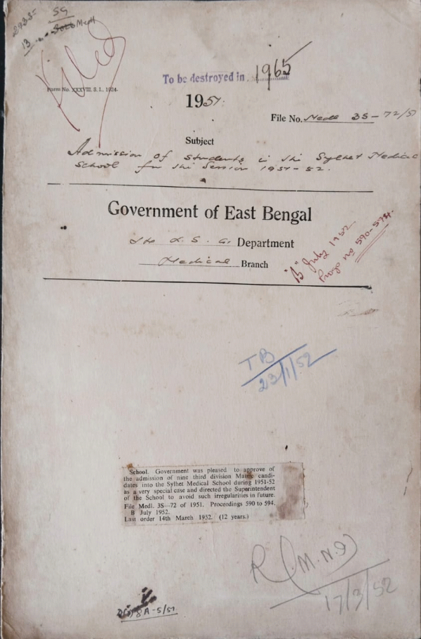 | Rack No. 10, Bundle No. 113, Sl No. 9343 Sanction of an arrear grant under head chemical Examiner | Rack No. 10, Bundle No. 113, Sl No. 9344 Payment of the advertisement bill for administration of students in the 1st Year Class of the Dacca Medical School | Rack No. 10, Bundle No. 113, Sl No. 9345 Acceptance of grants under different minor heads under the Major head “38 Medical” for the year 1949-50 | Rack No. 10, Bundle No. 113, Sl No. 9346 Admission of students in the Sylhet Medical School for the Senior 1951-52 | Rack No. 10, Bundle No. 113, Sl No. 9347 Proposal for exemption of the Hobiganj L.B. from payment of contribution towards Habiganj sub-divisional Hospital. | Rack No. 10, Bundle No. 113, Sl No. 9348 House rent allowance of Dr. Sultan Ahmed, Medical Officer, Bhedarganj Government Charitable Dispensary | Rack No. 10, Bundle No. 113, Sl No. 9349 Admission of Md. Ilias Ali in the 3rd year Class of the Dacca Medical College |