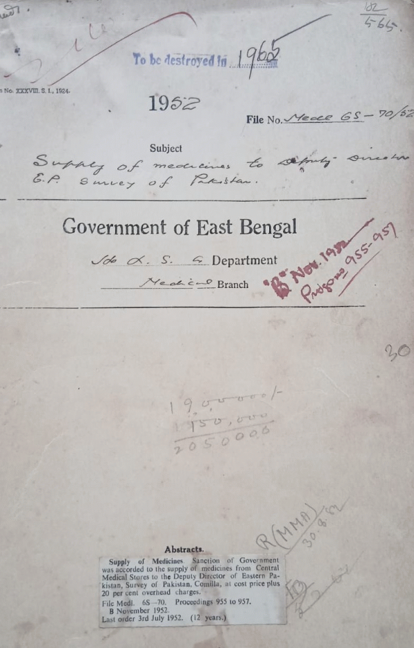 | Rack No. 10, Bundle No. 117 Sl No. 9727 Accommodation of Passport office in some portion of building attached to the Civil Surgeon, office, Pabna. | Rack No. 10, Bundle No. 117 Sl No. 9728 Sanction to the creation of whale time Post. or orderly for the Assistant S.G. C.M.S. Tejgaon. | Rack No. 10, Bundle No. 117 Sl No. 9729 Storm damage repairs to requisitioned building attached to Sadar Hospital at Noakhali. | Rack No. 10, Bundle No. 117 Sl No. 9730 Supply of medicines to Deputy Director E.P. Survey of Pakistan. | Rack No. 10, Bundle No. 117 Sl No. 9731 Live in the Substantive Post of Mr. Maulvi Abul Hossain Miah, under Chemical Examiner to this govt. of E.B. | Rack No. 10, Bundle No. 117 Sl No. 9732 Leave of Dr. Abdul Majid A/S. Jamalpur Sub-Division and Dispy. | Rack No. 10, Bundle No. 117 Sl No. 9733 Sanction of additional grant at the disposal of superintendent, Chittagong Medical School for the Payment of arrear charge for the year 1951-52. |