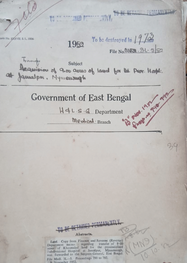 | Rack No. 10, Bundle No. 117 Sl No. 9731 Live in the Substantive Post of Mr. Maulvi Abul Hossain Miah, under Chemical Examiner to this govt. of E.B. | Rack No. 10, Bundle No. 117 Sl No. 9732 Leave of Dr. Abdul Majid A/S. Jamalpur Sub-Division and Dispy. | Rack No. 10, Bundle No. 117 Sl No. 9733 Sanction of additional grant at the disposal of superintendent, Chittagong Medical School for the Payment of arrear charge for the year 1951-52. | Rack No. 10, Bundle No. 117 Sl No. 9734 Transfer of 900 acres of land for the provincial Hospital at Jamalpur. | Rack No. 10, Bundle No. 117 Sl No. 9735 Charitable Institution and funds exemption from Income Tax Act. | Rack No. 10, Bundle No. 117 Sl No. 9736 Resignation tendered by Dr. Sujit Ranjan Chowdhury Medical, officer of Paindong Rural Dispy. | Rack No. 10, Bundle No. 117 Sl No. 9737 Purchase of furniture for T.B. ward at Mitford Hospital, Dacca. |