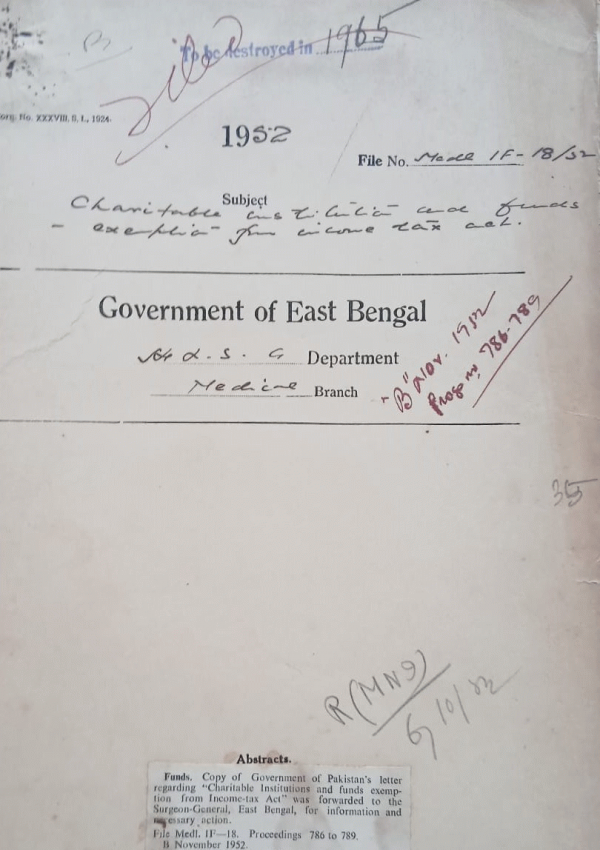 | Rack No. 10, Bundle No. 117 Sl No. 9732 Leave of Dr. Abdul Majid A/S. Jamalpur Sub-Division and Dispy. | Rack No. 10, Bundle No. 117 Sl No. 9733 Sanction of additional grant at the disposal of superintendent, Chittagong Medical School for the Payment of arrear charge for the year 1951-52. | Rack No. 10, Bundle No. 117 Sl No. 9734 Transfer of 900 acres of land for the provincial Hospital at Jamalpur. | Rack No. 10, Bundle No. 117 Sl No. 9735 Charitable Institution and funds exemption from Income Tax Act. | Rack No. 10, Bundle No. 117 Sl No. 9736 Resignation tendered by Dr. Sujit Ranjan Chowdhury Medical, officer of Paindong Rural Dispy. | Rack No. 10, Bundle No. 117 Sl No. 9737 Purchase of furniture for T.B. ward at Mitford Hospital, Dacca. | Rack No. 10, Bundle No. 117 Sl No. 9738 Construction of buildings for office of the Civil Surgeon at Jessore. |