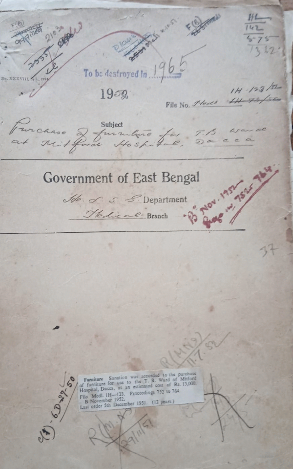| Rack No. 10, Bundle No. 117 Sl No. 9734 Transfer of 900 acres of land for the provincial Hospital at Jamalpur. | Rack No. 10, Bundle No. 117 Sl No. 9735 Charitable Institution and funds exemption from Income Tax Act. | Rack No. 10, Bundle No. 117 Sl No. 9736 Resignation tendered by Dr. Sujit Ranjan Chowdhury Medical, officer of Paindong Rural Dispy. | Rack No. 10, Bundle No. 117 Sl No. 9737 Purchase of furniture for T.B. ward at Mitford Hospital, Dacca. | Rack No. 10, Bundle No. 117 Sl No. 9738 Construction of buildings for office of the Civil Surgeon at Jessore. | Rack No. 10, Bundle No. 117 Sl No. 9739 Dr. Bashiruddin Ahmed fixation of pay for the Period from 15-8-47 to 20-11-47. | Rack No. 10, Bundle No. 117 Sl No. 9740 Payment of advertisement cost for inviting tenders for supply of Medical Stores etc. |