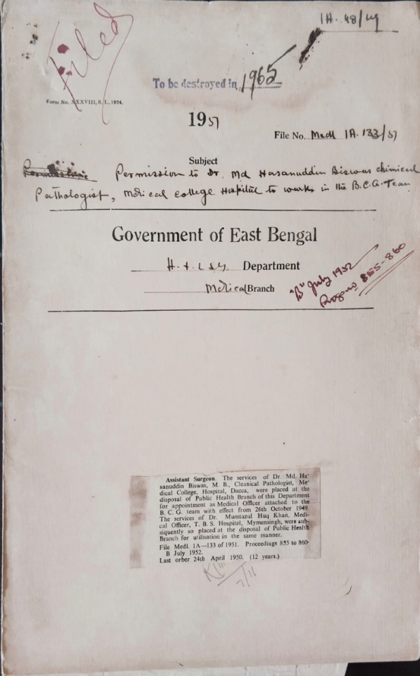 | Rack No. 10, Bundle No. 113, Sl No. 9358 Medical Officers for Jhiarakhi D.B. Shilaidale U.B. and hat Boalia Dispensaries | Rack No. 10, Bundle No. 113, Sl No. 9359 Gift of Artasram building to the Government for starting 4 bedded Hospital | Rack No. 10, Bundle No. 113, Sl No. 9360 Disposal of A.G. Hospital and emergency Hospital | Rack No. 10, Bundle No. 113, Sl No. 9361 Permission to Dr. Md. Hasanuddin Biswas, Clinical pathologist Medical College Hospital to works in the B.C.G. Team | Rack No. 10, Bundle No. 113, Sl No. 9362 Removal of the counter from Dacca Medical School building | Rack No. 10, Bundle No. 113, Sl No. 9363 Purchases of guinea pigs for use in Dacca Medical College | Rack No. 10, Bundle No. 113, Sl No. 9364 Information regarding number of new mental patients in E.B. Jails |
