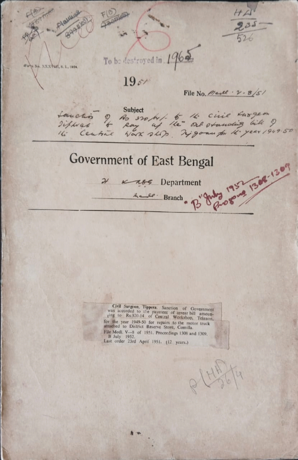 | Rack No. 10, Bundle No. 113, Sl No. 9363 Purchases of guinea pigs for use in Dacca Medical College | Rack No. 10, Bundle No. 113, Sl No. 9364 Information regarding number of new mental patients in E.B. Jails | Rack No. 10, Bundle No. 113, Sl No. 9365 Purchase of 4 cataract knives for Mitford Hospital, Dacca | Rack No. 10, Bundle No. 113, Sl No. 9366 Sanction of Rs. 320/14 for etc, repair of motor truck attached to the Comilla District | Rack No. 10, Bundle No. 113, Sl No. 9367 Special pay of Babu Radha Gobinda Saha compounder, Sadar Hospital Bogra for doing additional duties. | Rack No. 10, Bundle No. 113, Sl No. 9368 Purchase of Medicine without calling for tender | Rack No. 10, Bundle No. 113, Sl No. 9369 Government sanction for payment of advertisement bills |
