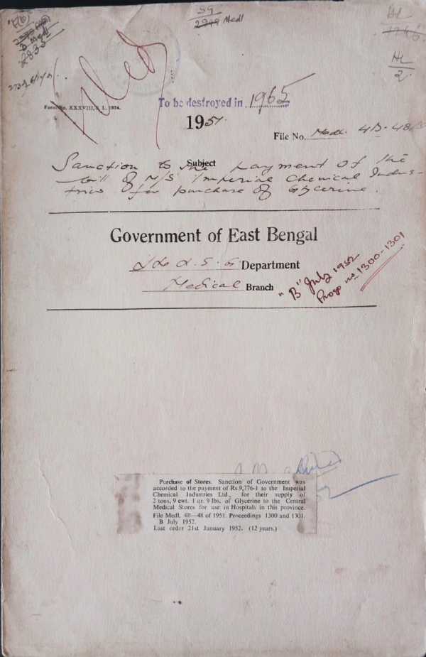 | Rack No. 10, Bundle No. 113, Sl No. 9365 Purchase of 4 cataract knives for Mitford Hospital, Dacca | Rack No. 10, Bundle No. 113, Sl No. 9366 Sanction of Rs. 320/14 for etc, repair of motor truck attached to the Comilla District | Rack No. 10, Bundle No. 113, Sl No. 9367 Special pay of Babu Radha Gobinda Saha compounder, Sadar Hospital Bogra for doing additional duties. | Rack No. 10, Bundle No. 113, Sl No. 9368 Purchase of Medicine without calling for tender | Rack No. 10, Bundle No. 113, Sl No. 9369 Government sanction for payment of advertisement bills | Rack No. 10, Bundle No. 113, Sl No. 9370 Disposal of structures of A.G. at Perojpur in the District of Bakerganj | Rack No. 10, Bundle No. 113, Sl No. 9371 Repairs of Ambulance at Central Workshop, Tejgaon |