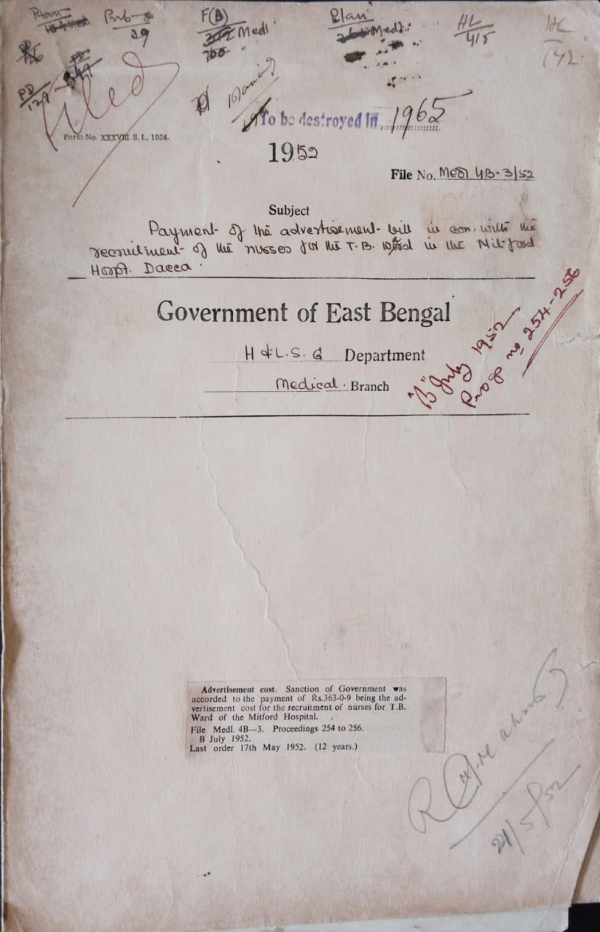 | Rack No. 10, Bundle No. 113, Sl No. 9372 Special pay to be drawn by Dr. Md. Ibrahim, Additional Physician, Medical College Hospital, Dacca | Rack No. 10, Bundle No. 113, Sl No. 9373 Theft of stores of the abolished A.G. Hospital at Laksam | Rack No. 10, Bundle No. 113, Sl No. 9374 Supply of spirits etc. to the Principal, Chittagong College | Rack No. 10, Bundle No. 113, Sl No. 9375 Payment of the advertisement bill in connection with the recruitment of nurses for the T.B. Ward in the Mitford Hospital, Dacca. | Rack No. 10, Bundle No. 113, Sl No. 9377 Motor Car advance to Dr. S.A. Laskar, M.B.D.T.M. D.O.N.S. Assistant Professor of Ophthalmology, Medical College, Dacca | Rack No. 10, Bundle No. 113, Sl No. 9378 Proceeding of the meeting executive committee of Pakistan Medical Association. | Rack No. 10, Bundle No. 113, Sl No. 9379 Bill for carrying charges of surplus articles of Baradi A.G. Hospital |