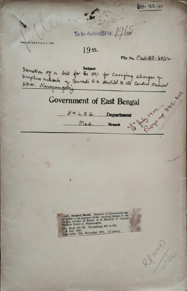 | Rack No. 10, Bundle No. 113, Sl No. 9375 Payment of the advertisement bill in connection with the recruitment of nurses for the T.B. Ward in the Mitford Hospital, Dacca. | Rack No. 10, Bundle No. 113, Sl No. 9377 Motor Car advance to Dr. S.A. Laskar, M.B.D.T.M. D.O.N.S. Assistant Professor of Ophthalmology, Medical College, Dacca | Rack No. 10, Bundle No. 113, Sl No. 9378 Proceeding of the meeting executive committee of Pakistan Medical Association. | Rack No. 10, Bundle No. 113, Sl No. 9379 Bill for carrying charges of surplus articles of Baradi A.G. Hospital | Rack No. 10, Bundle No. 113, Sl No. 9380 Free supply of streptomycin to Binode Behari Das Mushatchi Maulvi Bazar Sub-divisional Provincialized Hospital, Sylhet | Rack No. 10, Bundle No. 113, Sl No. 9381 Retention of 12 T.B. Segregation Hospital in East Bengal | Rack No. 10, Bundle No. 113, Sl No. 9382 Behari Das Mushatchi Maulvi Bazar Sub-divisional Provincialized Hospital, Sylhet |