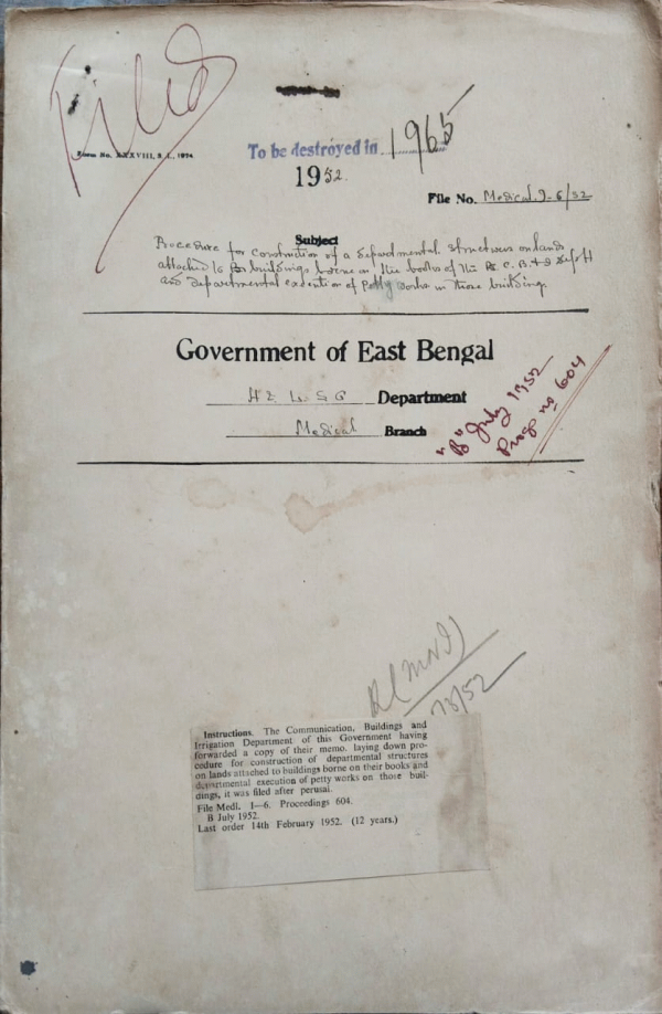 | Rack No. 10, Bundle No. 113, Sl No. 9380 Free supply of streptomycin to Binode Behari Das Mushatchi Maulvi Bazar Sub-divisional Provincialized Hospital, Sylhet | Rack No. 10, Bundle No. 113, Sl No. 9381 Retention of 12 T.B. Segregation Hospital in East Bengal | Rack No. 10, Bundle No. 113, Sl No. 9382 Behari Das Mushatchi Maulvi Bazar Sub-divisional Provincialized Hospital, Sylhet | Rack No. 10, Bundle No. 113, Sl No. 9383 Precedence for construction of departmental structures | Rack No. 10, Bundle No. 113, Sl No. 9384 Construction of “Rural Dispensaries and 4 bedded wards in Thana Hospitals in the District of Bakerganj | Rack No. 10, Bundle No. 113, Sl No. 9385 Arrear rent of the Chandpur A.G. Hospital (Abolished) | Rack No. 10, Bundle No. 113, Sl No. 9386 Payment of held 4P salary of Md. Afzal Hussain Ex-additional Clerk, civil Surgeons office Rajshahi for the period from 18-10-47 to 4-2-48 |
