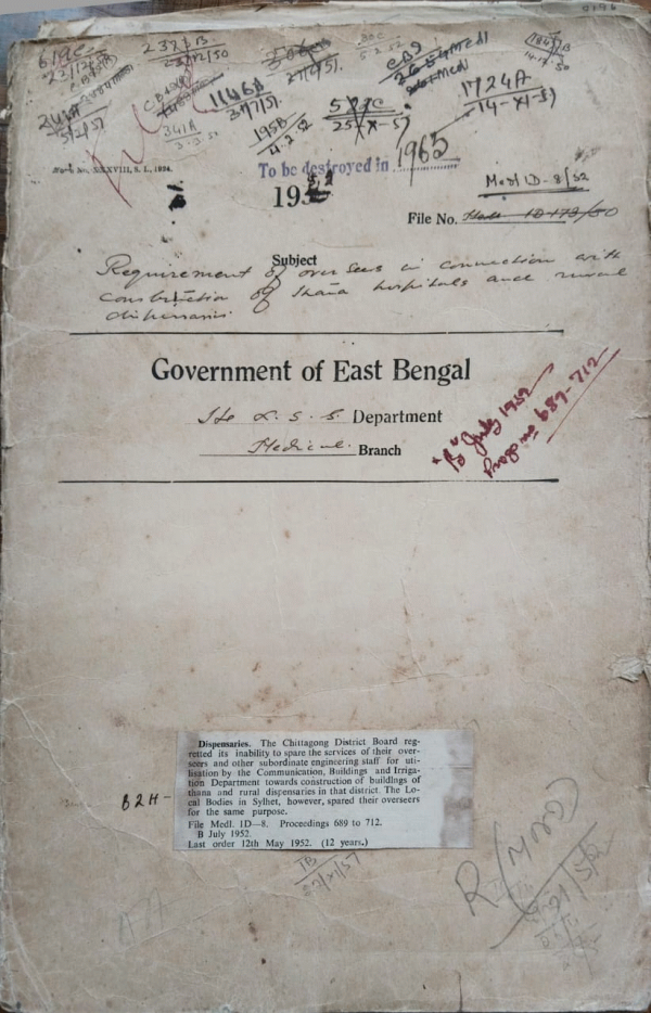| Rack No. 10, Bundle No. 113, Sl No. 9381 Retention of 12 T.B. Segregation Hospital in East Bengal | Rack No. 10, Bundle No. 113, Sl No. 9382 Behari Das Mushatchi Maulvi Bazar Sub-divisional Provincialized Hospital, Sylhet | Rack No. 10, Bundle No. 113, Sl No. 9383 Precedence for construction of departmental structures | Rack No. 10, Bundle No. 113, Sl No. 9384 Construction of “Rural Dispensaries and 4 bedded wards in Thana Hospitals in the District of Bakerganj | Rack No. 10, Bundle No. 113, Sl No. 9385 Arrear rent of the Chandpur A.G. Hospital (Abolished) | Rack No. 10, Bundle No. 113, Sl No. 9386 Payment of held 4P salary of Md. Afzal Hussain Ex-additional Clerk, civil Surgeons office Rajshahi for the period from 18-10-47 to 4-2-48 | Rack No. 10, Bundle No. 113, Sl No. 9387 Repair and painting of some serviceable furniture for the Sadar Hospital, Comilla |
