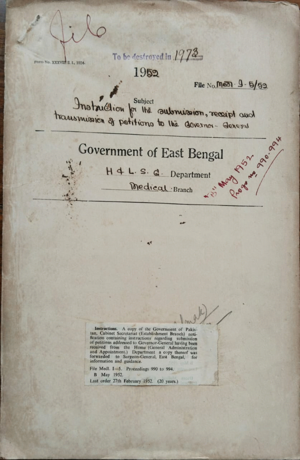 | Rack No. 10, Bundle No. 113, Sl No. 9391 Scheme of anti-tuberculosis prepared by Dr. Mohammad Ibrahim an East Bengal Scholar in the United Kingdom | Rack No. 10, Bundle No. 113, Sl No. 9392 Terms to be allowed to government officials awarded fellowship/ scholarship by the International organizations rendering technical assistance to Pakistan | Rack No. 10, Bundle No. 113, Sl No. 9393 Retention of 3 posts of E.M. office attached of the general Hospital, Chittagong | Rack No. 10, Bundle No. 113, Sl No. 9394 Instruction for the submission receipt and transmission of petitions to the Governor General | Rack No. 10, Bundle No. 113, Sl No. 9395 Purchase of course and reference Books for 1951-52 | Rack No. 10, Bundle No. 113, Sl No. 9396 List of publications area in the secretariat Library | Rack No. 10, Bundle No. 113, Sl No. 9397 Nil grant statement for 1950-51 under charges a England 38 Medical |