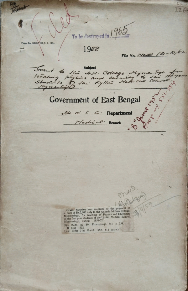 | Rack No. 10, Bundle No. 113, Sl No. 9396 List of publications area in the secretariat Library | Rack No. 10, Bundle No. 113, Sl No. 9397 Nil grant statement for 1950-51 under charges a England 38 Medical | Rack No. 10, Bundle No. 113, Sl No. 9398 Grant to the Jagannath College Dacca for teaching physics and chemistry | Rack No. 10, Bundle No. 113, Sl No. 9399 Grant to the A.M. College Mymensingh for teaching Physics and Chemistry to the 1st year students of the Lytton Medical School, Mymensingh. | Rack No. 10, Bundle No. 113, Sl No. 9400 Refund of security deposits | Rack No. 10, Bundle No. 114, Sl No. 9401 Concession to the Medical licentiates with war services is admitted to the Condensed M.B. Course. | Rack No. 10, Bundle No. 114, Sl No. 9402 Peterminati of pay on promotions made since 18.7.47. |