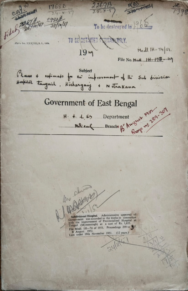 | Rack No. 10, Bundle No. 113, Sl No. 9400 Refund of security deposits | Rack No. 10, Bundle No. 114, Sl No. 9401 Concession to the Medical licentiates with war services is admitted to the Condensed M.B. Course. | Rack No. 10, Bundle No. 114, Sl No. 9402 Peterminati of pay on promotions made since 18.7.47. | Rack No. 10, Bundle No. 114, Sl No. 9403 Plans & estimates for the improvement of the Sub-divisional Hospital Tangain, Kishorganj, Netrokona District Mymensingh. | Rack No. 10, Bundle No. 114, Sl No. 9404 Possession of the buildings by acquisition for use as outdoor Department of the Sylhet Hospital. | Rack No. 10, Bundle No. 114, Sl No. 9405 Permission to Dr. Z.A. Chowdhury teacher of Jurisprudence, Sylhet. | Rack No. 10, Bundle No. 114, Sl No. 9406 Grant of special pay to Mvi. T. Hossain P.A. to S.I.E.B. for doing double duties. |