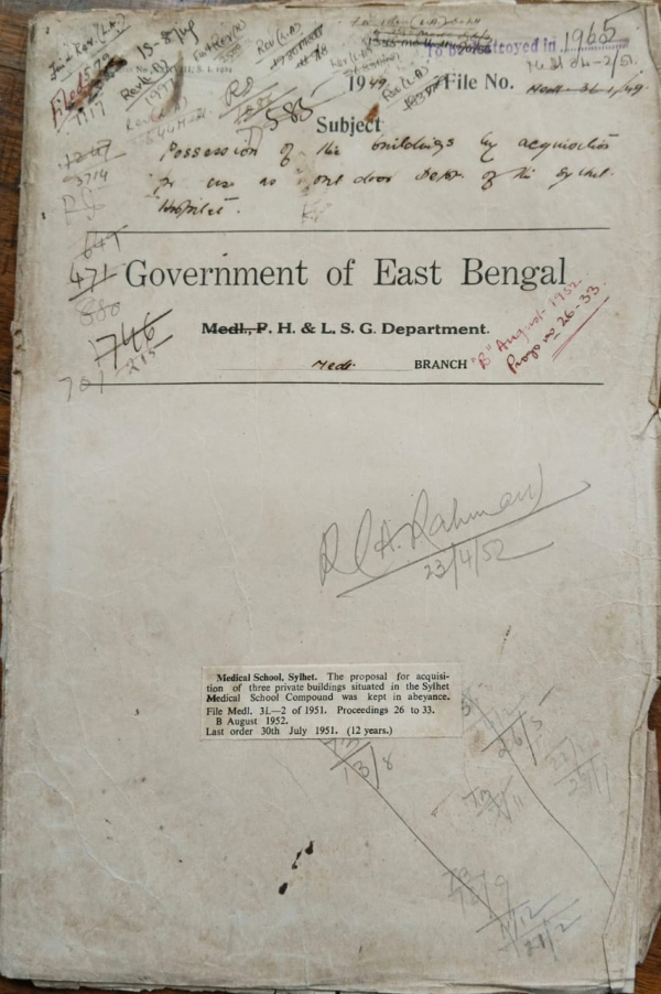 | Rack No. 10, Bundle No. 114, Sl No. 9401 Concession to the Medical licentiates with war services is admitted to the Condensed M.B. Course. | Rack No. 10, Bundle No. 114, Sl No. 9402 Peterminati of pay on promotions made since 18.7.47. | Rack No. 10, Bundle No. 114, Sl No. 9403 Plans & estimates for the improvement of the Sub-divisional Hospital Tangain, Kishorganj, Netrokona District Mymensingh. | Rack No. 10, Bundle No. 114, Sl No. 9404 Possession of the buildings by acquisition for use as outdoor Department of the Sylhet Hospital. | Rack No. 10, Bundle No. 114, Sl No. 9405 Permission to Dr. Z.A. Chowdhury teacher of Jurisprudence, Sylhet. | Rack No. 10, Bundle No. 114, Sl No. 9406 Grant of special pay to Mvi. T. Hossain P.A. to S.I.E.B. for doing double duties. | Rack No. 10, Bundle No. 114, Sl No. 9407 Payment of Rs. 200/- as Priges to the P.T.S. Nurses. |