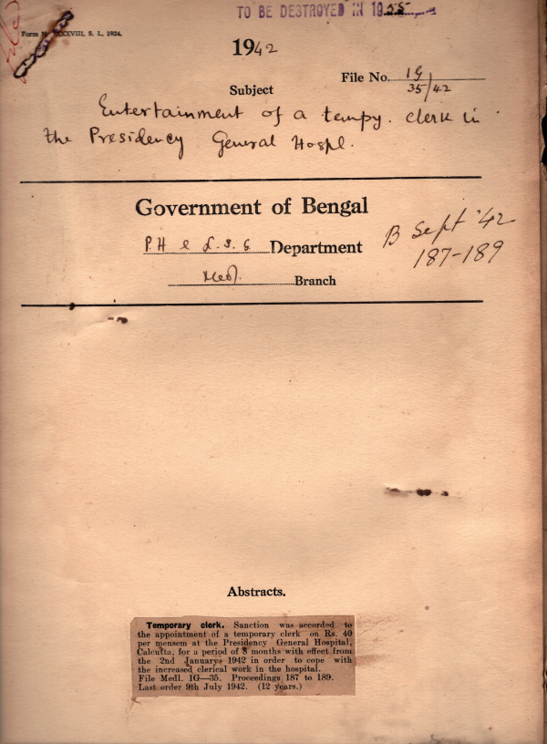 | Rack No. 09; Bundle No. 92 SL No. 7156 Petition from Miss Bibhabati Ch. a student of the Campbell Medical School for a stipend. | Rack No. 09; Bundle No. 92 SL No. 7157 Statement of grant or appropriation and expenditure up to March 1942 (Final). | Rack No. 09; Bundle No. 92 SL No. 7158 Business hours for Banks. | Rack No. 09; Bundle No. 92 SL No. 7159 Entertainment of a temporary clerk in the P.G. Hospital. | Rack No. 09; Bundle No. 92 SL No. 7160 Relaxation of S.M.F. rules 3 in favour of Kamalakanta Ch. a Student of the Cal. Medical School. | Rack No. 09; Bundle No. 92 SL No. 7161 Permission to Santimoy Mukherjee, a student of National Medical Institute to appear at the Inter-mediate Licentiateship Exam Relaxation of rule 3. | Rack No. 09; Bundle No. 92 SL No. 7162 Rates of warm clothing admissible under rule 10 of the Darjeeling allowance code. |