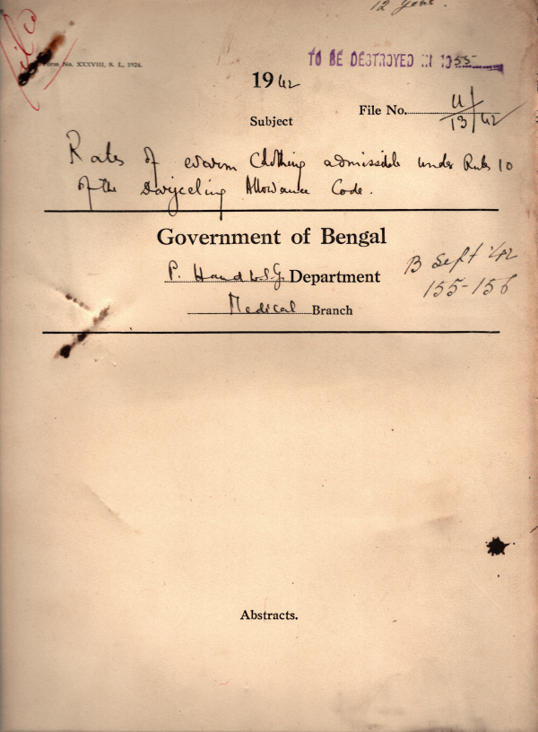 | Rack No. 09; Bundle No. 92 SL No. 7159 Entertainment of a temporary clerk in the P.G. Hospital. | Rack No. 09; Bundle No. 92 SL No. 7160 Relaxation of S.M.F. rules 3 in favour of Kamalakanta Ch. a Student of the Cal. Medical School. | Rack No. 09; Bundle No. 92 SL No. 7161 Permission to Santimoy Mukherjee, a student of National Medical Institute to appear at the Inter-mediate Licentiateship Exam Relaxation of rule 3. | Rack No. 09; Bundle No. 92 SL No. 7162 Rates of warm clothing admissible under rule 10 of the Darjeeling allowance code. | Rack No. 09; Bundle No. 92 SL No. 7163 Correspondence resting with your Memo. No. 841/M-1, dated the 27th April, 1942. | Rack No. 09; Bundle No. 92 SL No. 7164 Air Service between Calcutta and Delhi. | Rack No. 09; Bundle No. 92 SL No. 7165 Medical attendance on control Govt. officers and establishment in muffassal Appointment of fees between medical officers. |